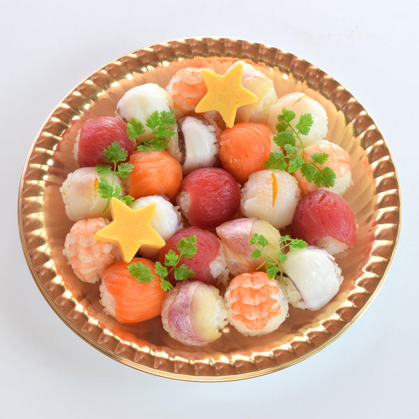 ●内容:てまり寿司(やりいか、金目鯛、サーモン)各3個、てまり寿司(海老、まぐろ、真だこ)各4個