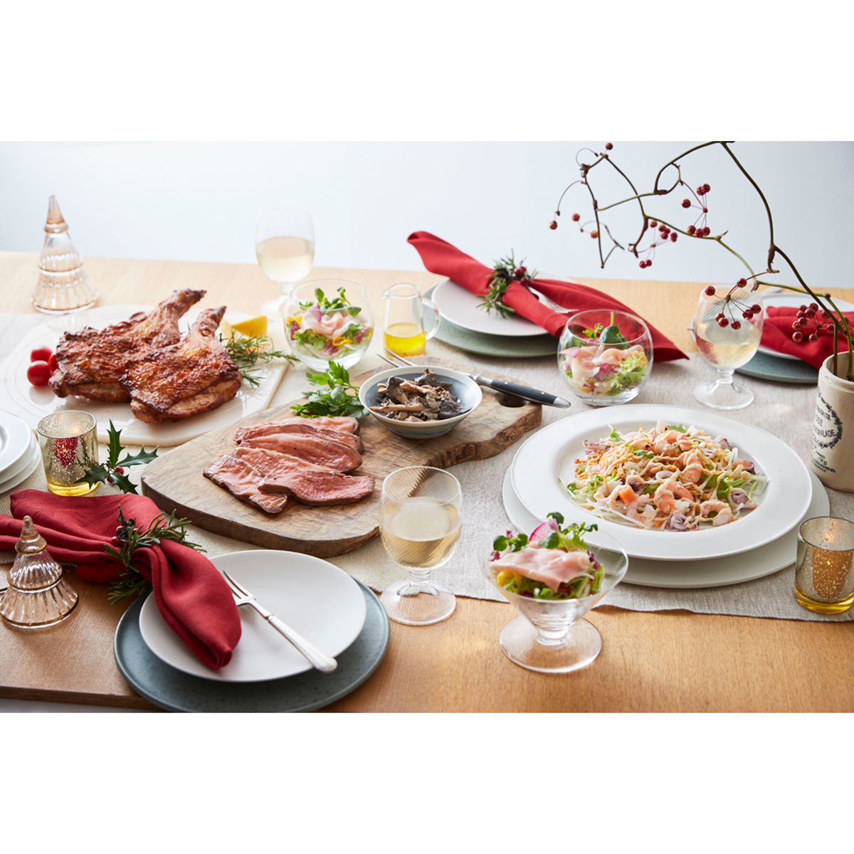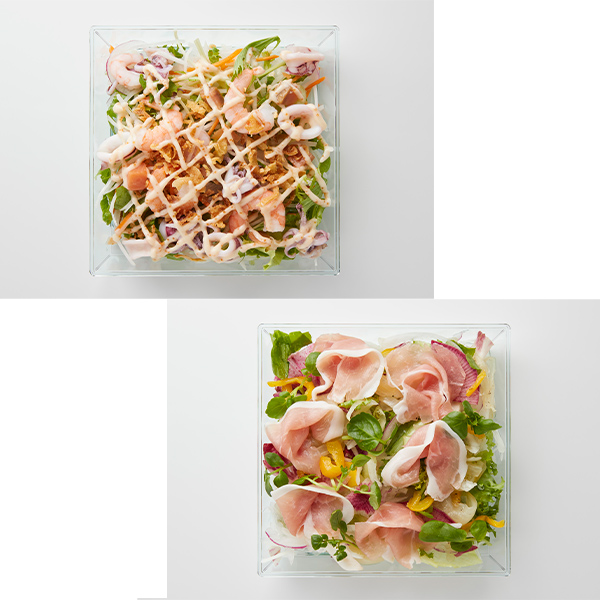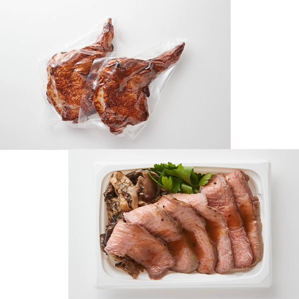 ●内容:桜島どりのもも肉ロースト2個/トリュフ香る牛肉グリル 霜降りひらたけ添え200g/北海道産生ハムとルッコラの華やぎサラダ(シャルドネビネガードレッシング付き)200g/たっぷり海の幸の美味サラダ200g