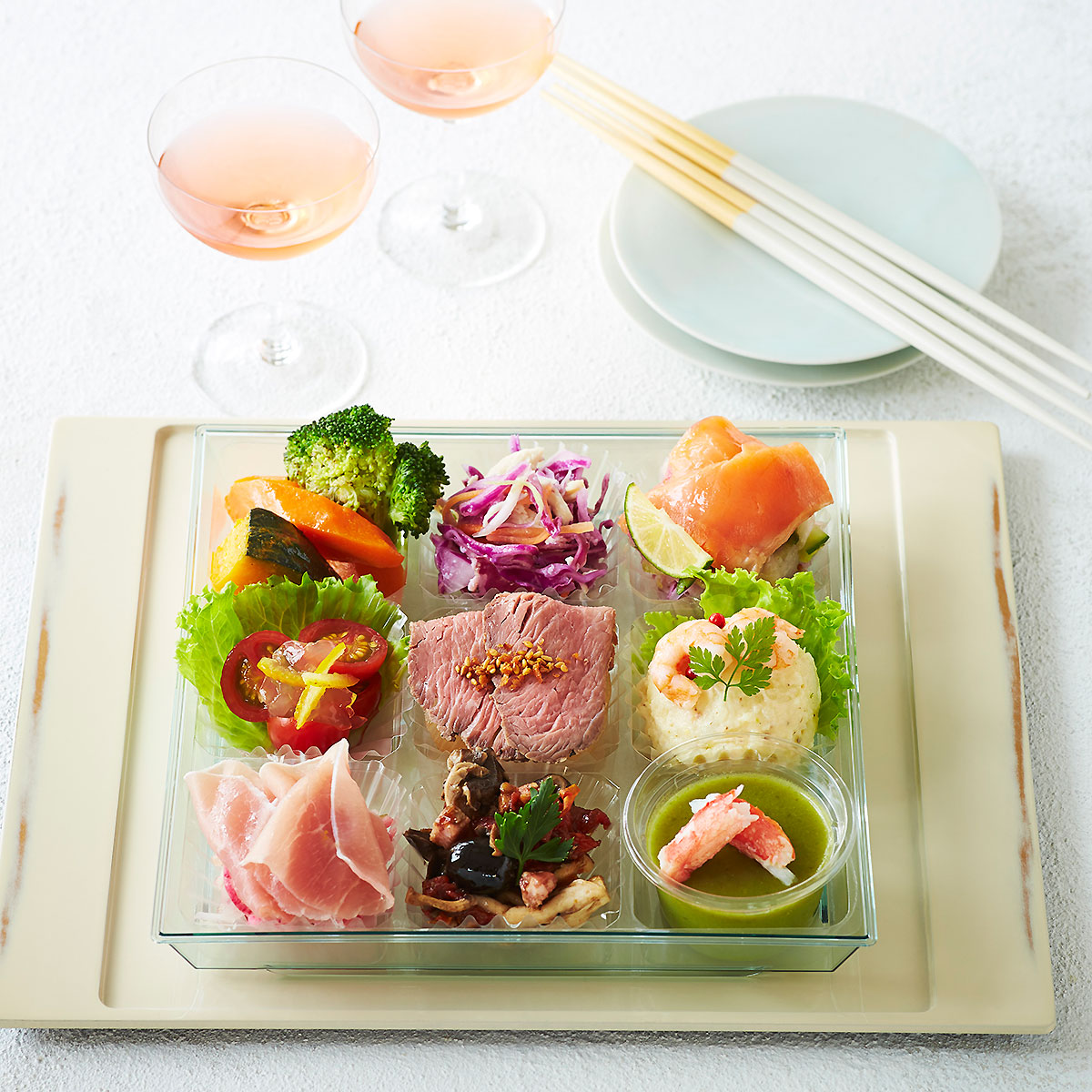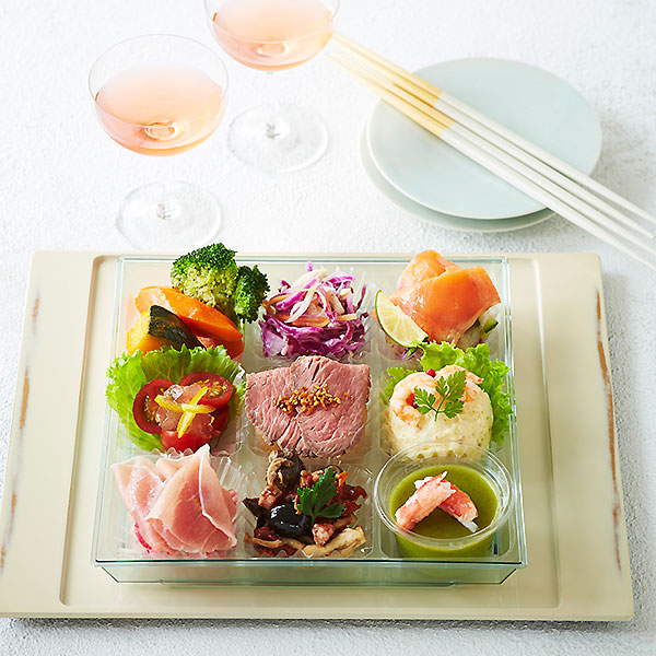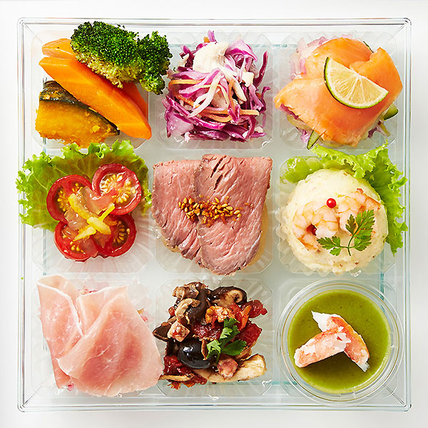 ●内容:山椒香る焼き野菜/プチトマトのジュレ添え/生ハムと玉ねぎのサラダ/塩麹チキンと紫キャベツのサラダ/ローストビーフのサラダ/きのことセミドライトマトのマリネ/サーモントラウトマリネ すだち添え/海老ポテトサラダ/緑野菜のムース