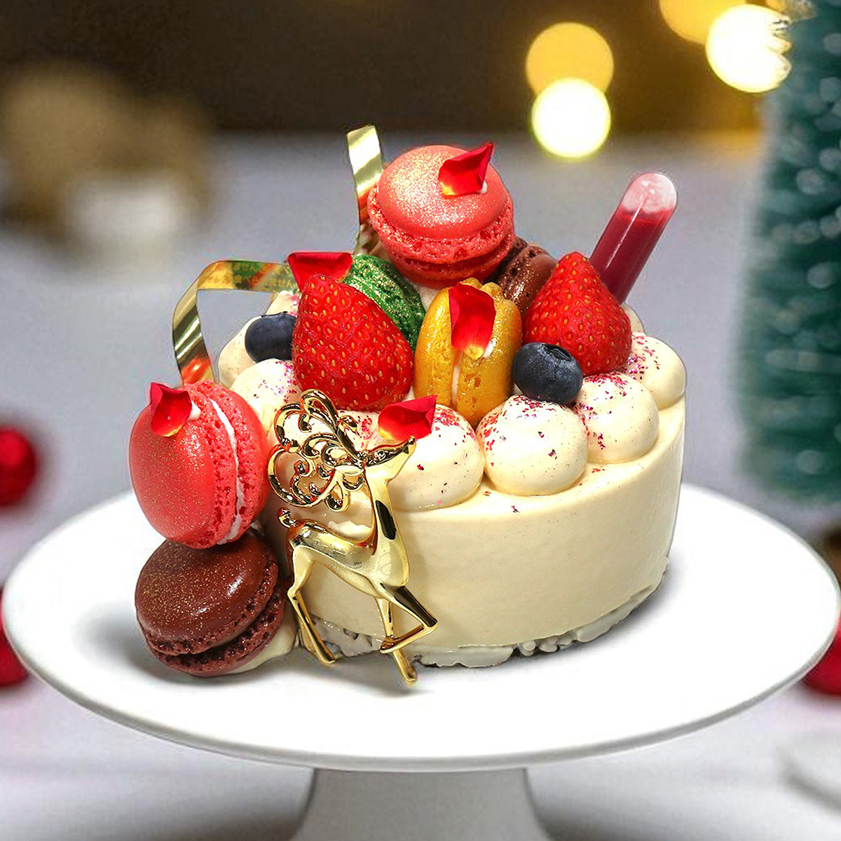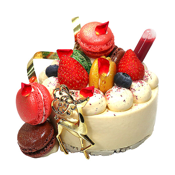 ザクザクとしたクルスティヤンの上に、しっとりとしたスポンジ、ピスターシュクリーム、フランボワーズクリーム、ホワイトチョコのムースを重ねました。色とりどりのミニマカロンとベリー、金のトナカイを飾った、華やかでときめくケーキです。