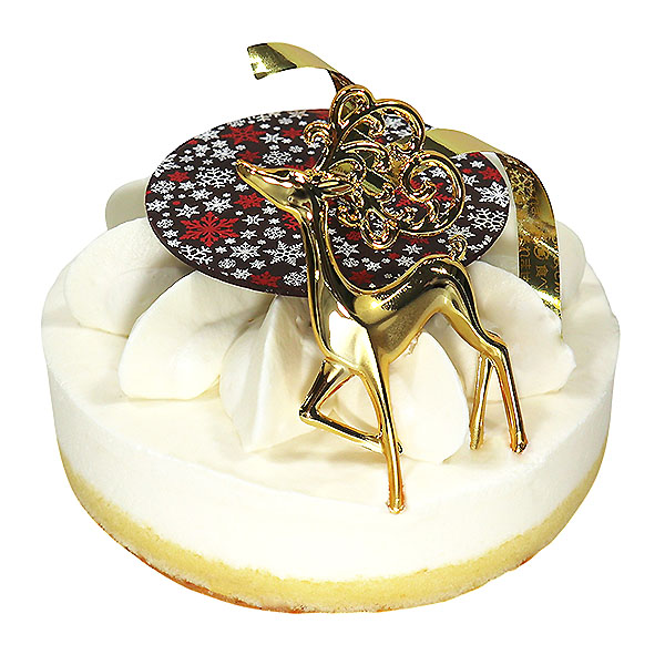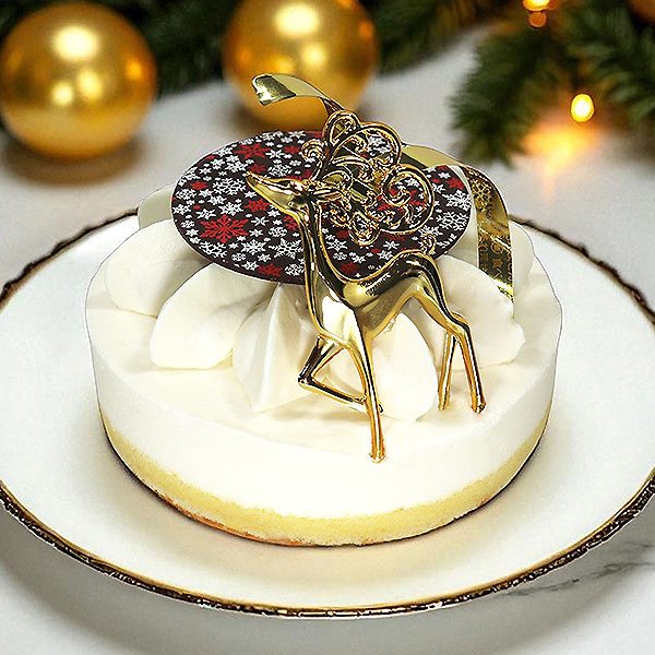 軽やかな口あたりのシャンティと、雪の結晶柄をあしらったショコラを飾り、華やかなオーナメントでクリスマスらしい仕上がりに。爽やかな酸味とやさしい甘みが広がる、見た目も味わいも華やかなレアチーズケーキです。