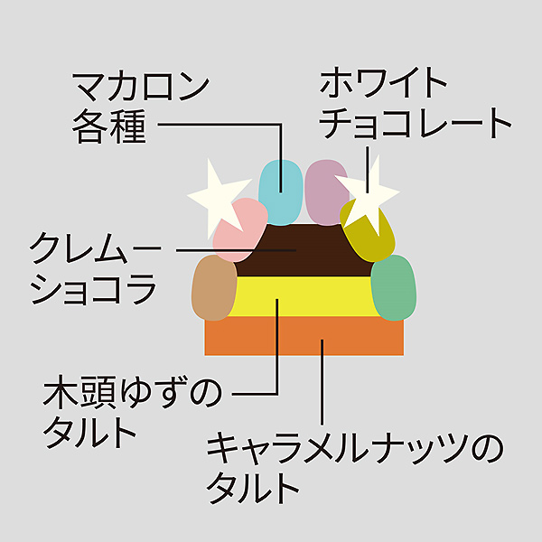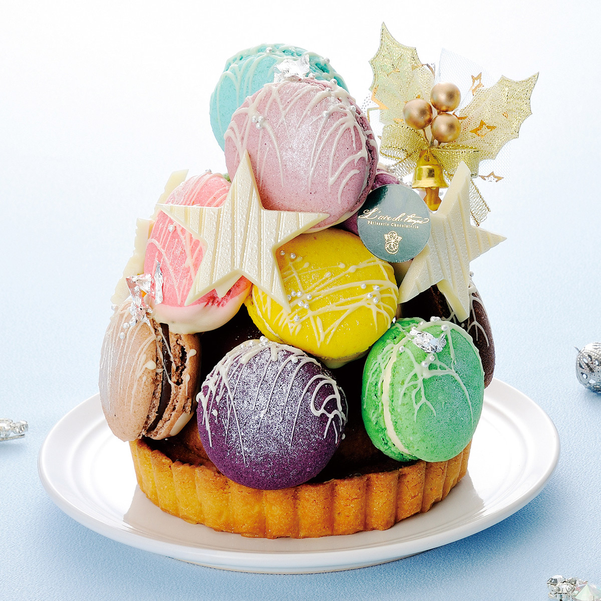 25周年に合わせたマカロンタワーのケーキ。当店自慢の10種類のマカロンに記念に合わせた2種類(ハニーチーズ、青りんご&赤りんご)の12種類をキャラメルナッツのタルト、木頭ゆずのタルト、クレムーショコラの土台に飾り付けました。