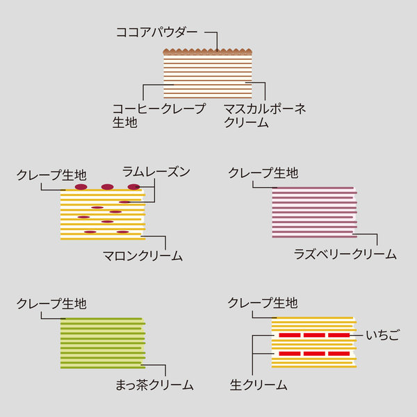 ●内容:ミルクレープ5種各2個(いちご、くりとラムレーズン、抹茶、フランボワーズ、ティラミス)