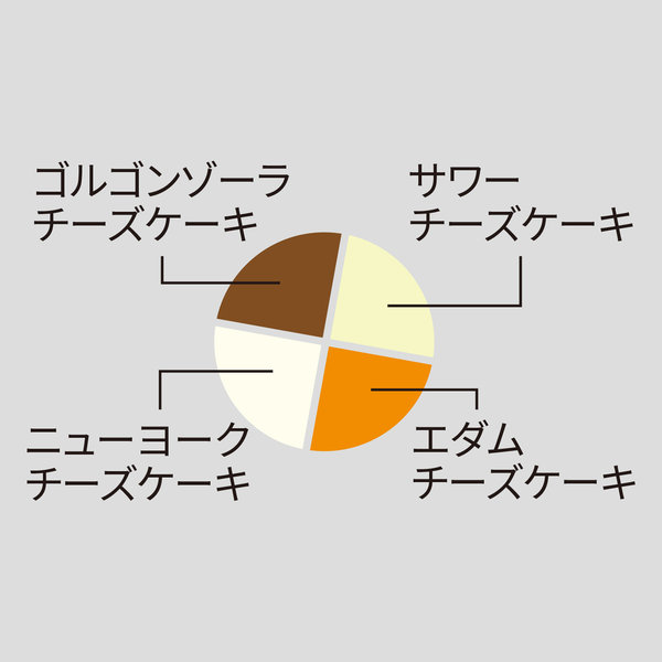エダムチーズケーキ、ニューヨークチーズケーキ、サワーチーズケーキ、ゴルゴンゾーラチーズケーキ4種のアソートです。良質な素材を使用したシンプルで個性的な濃厚チーズケーキです。