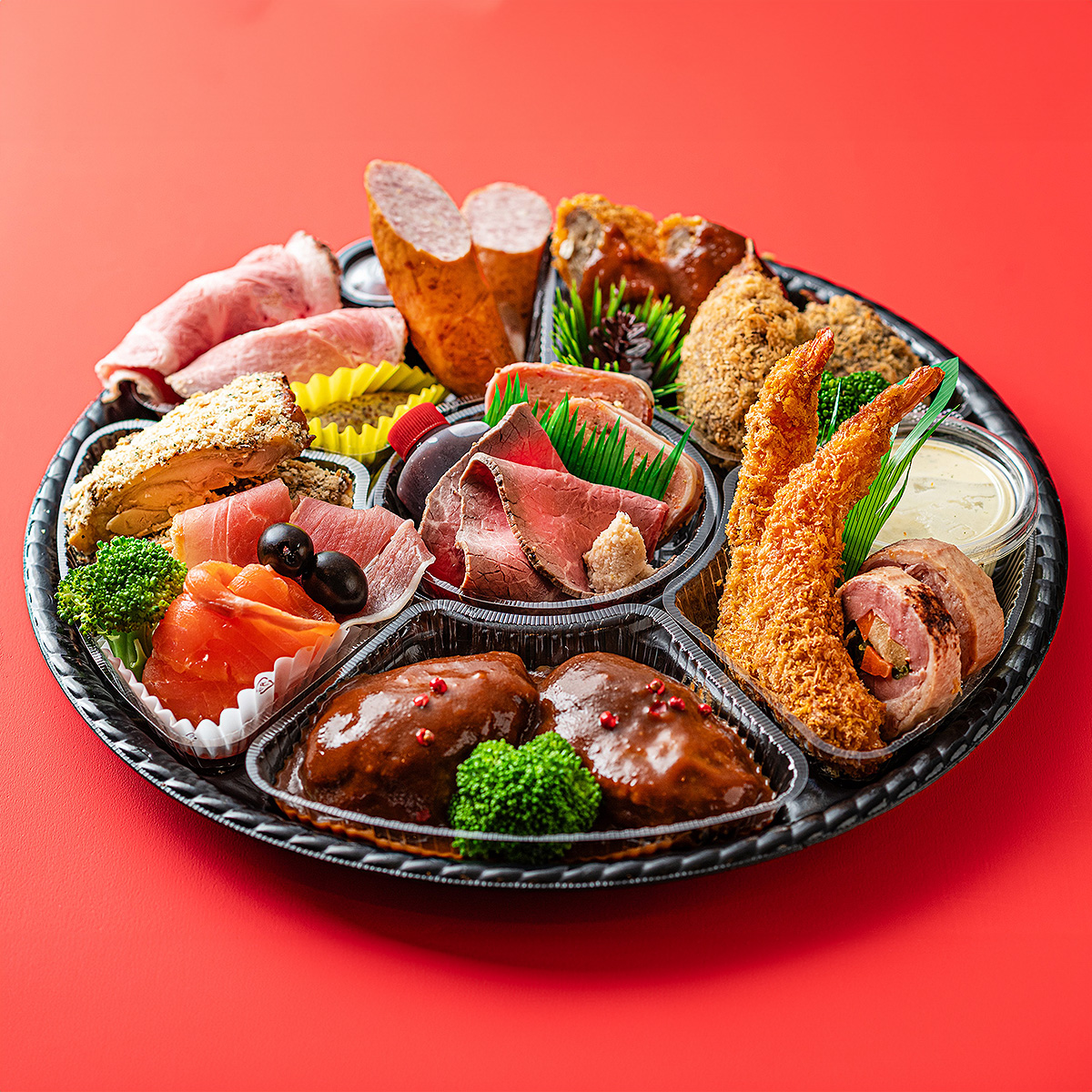 ●内容:コノヨシ特製ハンバーグ、エビフライ、ジャンボ3色巻、オマール海老爪クリームコロッケ、メンチカツ、コノヨシポーク、道産豚フランク、若鶏香草パン粉焼き、スモークサーモン、生ハム、アプリコットベーコン、ローストビーフ、ブロッコリーマリネ、ブラックオリーブ