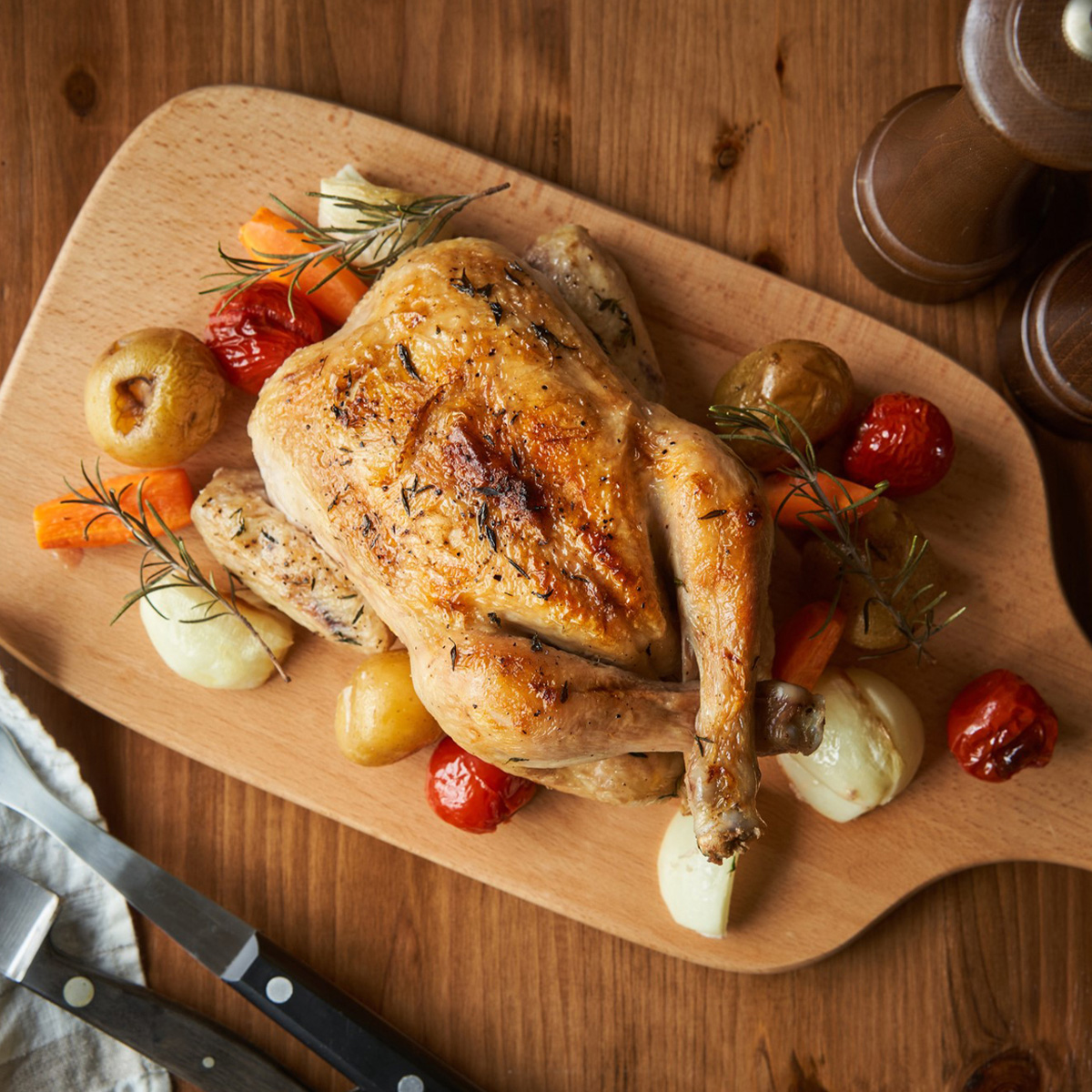 丸ごと一羽をじっくり焼き上げたローストチキン。皮は香ばしく、中はジューシー。食卓を華やかに彩る特別な一品です。