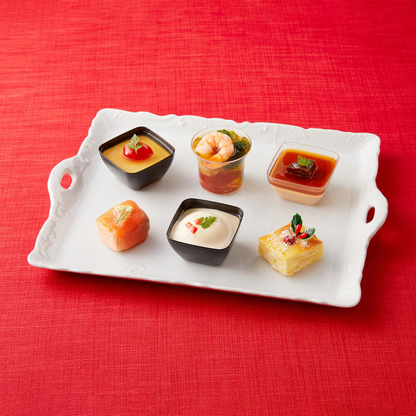 ●内容:白身魚の冷製、海老・帆立と野菜のコンソメジュレ、うにのフラン、チーズ香るポテトのミルフィーユオムレツ、サーモントラウトのテリーヌ風