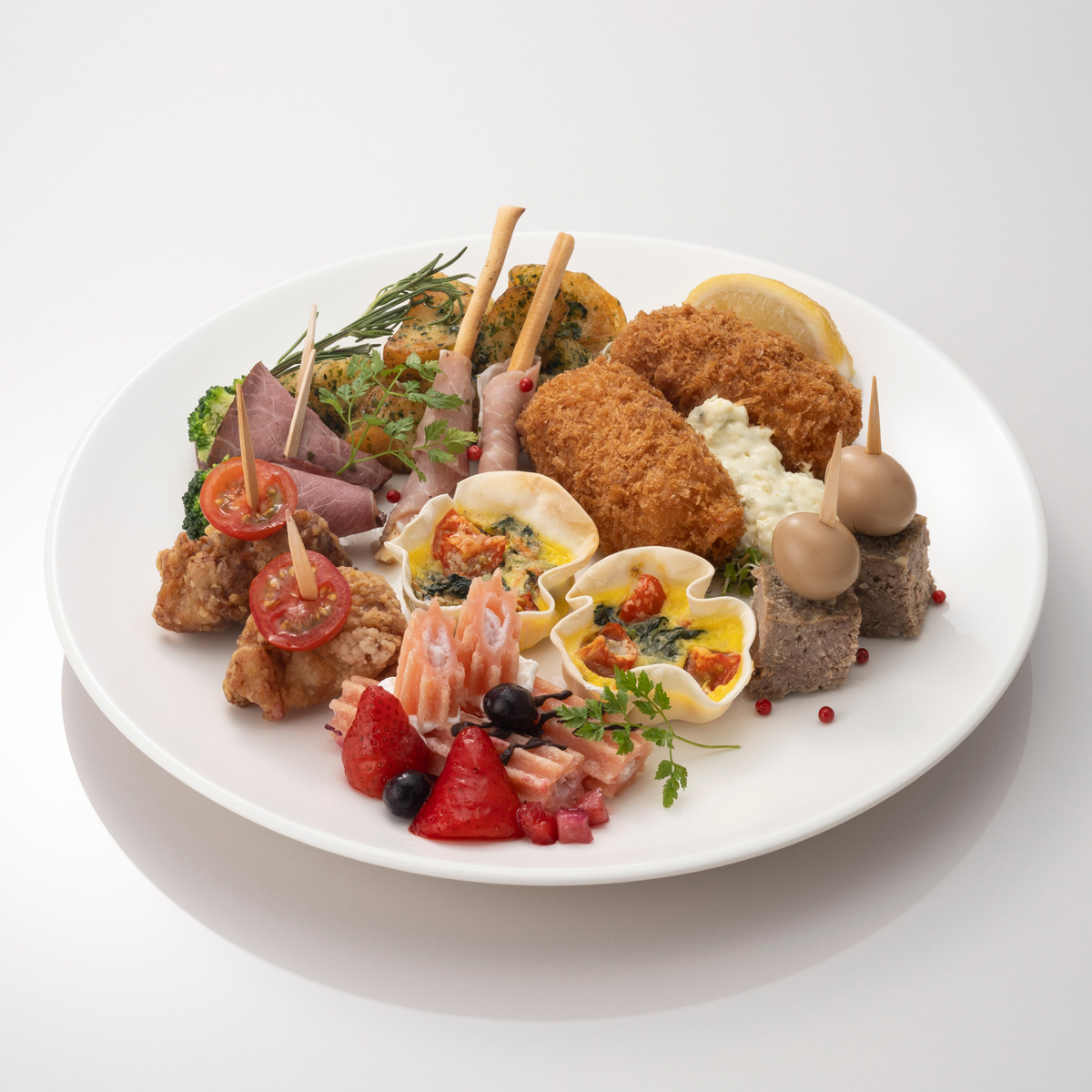 ●内容:ローストビーフ、唐揚げ、煮込みハンバーグ、カニクリームコロッケ、スモークサーモン、生ハムクリームチーズ、ポテトサラダ、生ハムマリネ、フライドポテト