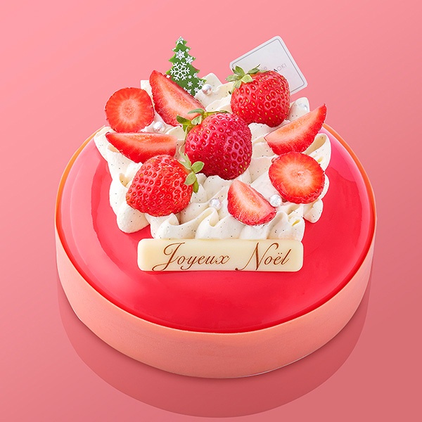 艶やかなグラサージュが輝く「ノエル フレーズ ヴァニーユ」はショコラブランで仕立てた繊細なイチゴのクリームと、なめらかなバニラクリームが織りなす二重奏。その間に忍ばせた、果実感あふれるイチゴのジュレが、ひと口ごとに華やかな余韻を広げます。ビビットで煌びやかな色合いがクリスマスのテーブルを華やかに彩ります。
