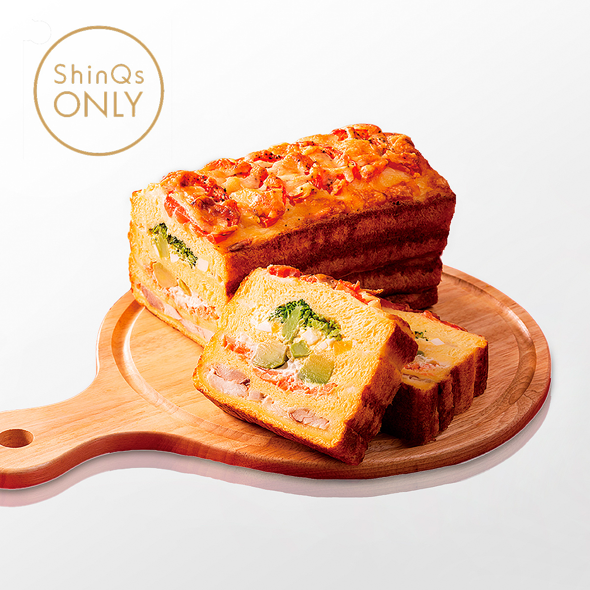 ●内容:3層のクロックムッシュ(チキン、アボカド&サーモン、卵&ブロッコリー)をフレンチトーストにしたケークサレ(甘くないケーキ)。
