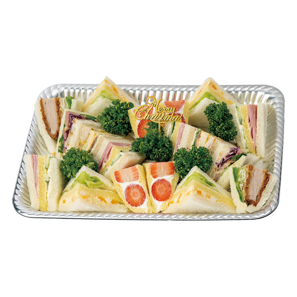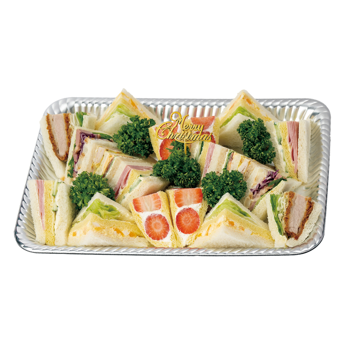 ●内容:18切れ(5~6人前)、いちご4切れ、ヒレカツ2切れ、タンドリーチキン2切れ、ハム&きゅうり4切れ、たまご&レタス4切れ、合鴨ロースト&ポテトサラダ2切れ。