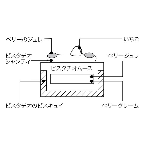 コクのあるピスタチオのムースとビスキュイに、甘酸っぱいベリーのジュレとクレーム。ナッツの深い風味と、ベリーの鮮やかな酸味のハーモニーが絶妙です。