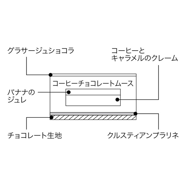 コーヒーの香りのチョコレートムースにバナナのジュレ、キャラメルとコーヒーのクレーム、チョコレート生地、クルスティアンプラリネの重層的な美味です。
