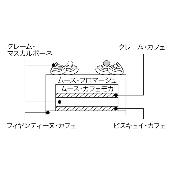 コーヒーが香るビスキュイとムース、マスカルポーネやクリームチーズを重ねたティラミス。クリーミーな味わいにサクサクのフィヤンティーヌがアクセント。