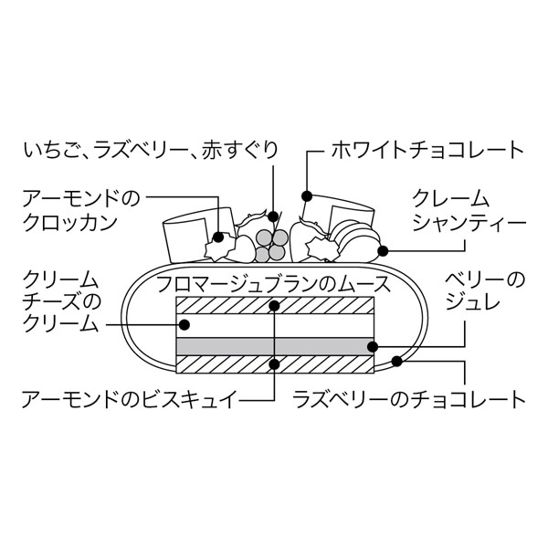 フロマージュブランのムースに、クリームチーズのクリームとラズベリーのジュレをあわせたレアチーズケーキ。酸味と甘み、口どけの良さをご堪能ください。