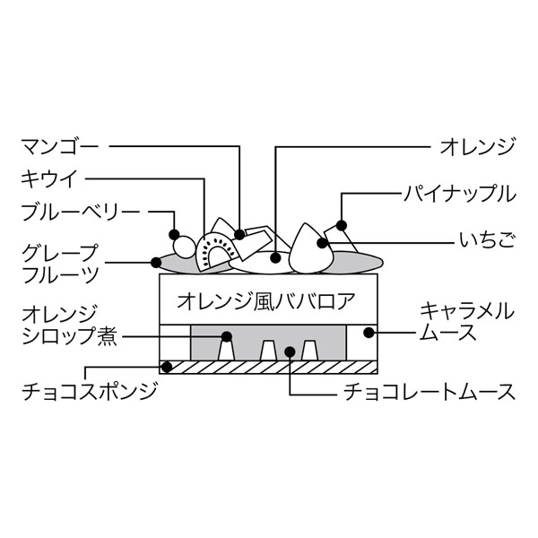 キャラメル、チョコレート、オレンジ風ババロアを重ね、新鮮なフルーツで華やかにデコレーションしました。果物のおいしさが際立つ、専門店の味わいです。