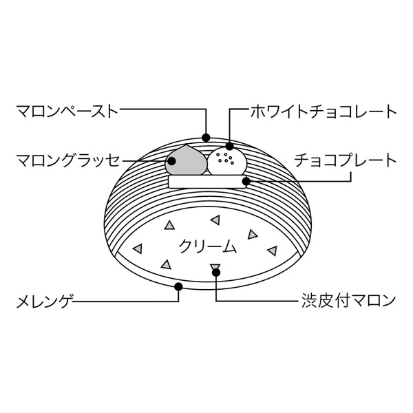 フランスから輸入したマロンペーストは濃厚なバニラ風味。サクサクのメレンゲと渋皮付きマロン入りのクリームをマロンペーストで飾った伝統のモンブランです。