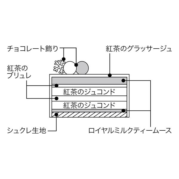 紅茶を煮出し芳醇な香りに仕上げたほど良い甘さの生地にブリュレやムースが調和。ロイヤルミルクティーのような高貴な味わいとクリーミーな食感が魅力です。