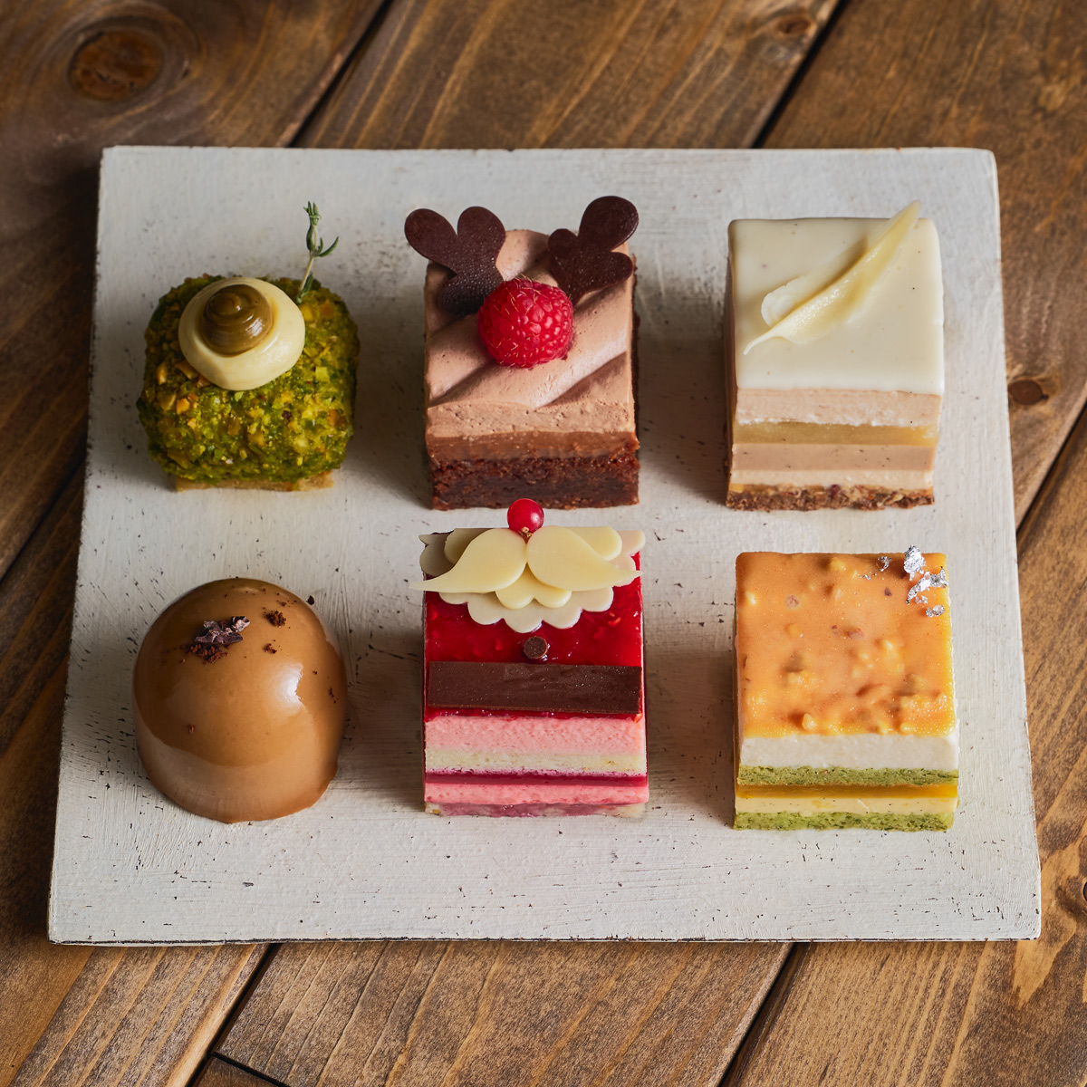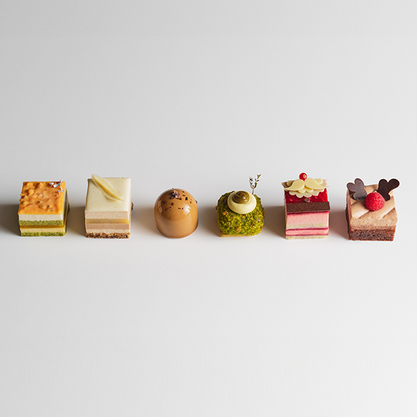 ●内容:プチガトー6個(ピスタチオムース、プラリネカフェ、ベリーサンタムース、ショコラトナカイ、栗と洋なしムース、レモン・バナナ・バジルムース)
