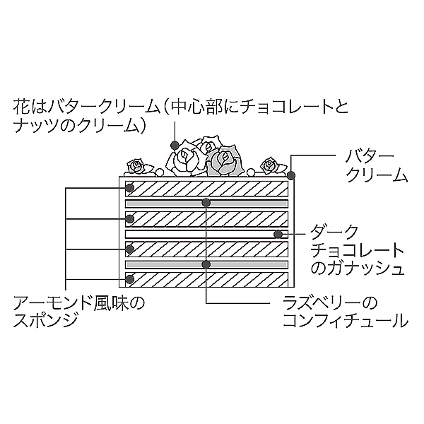おとぎ話に出てくるようなクラシカルなティーカップをイメージした、繊細なお花のデコレーションが印象的なケーキ。中にしのばせたラズベリーとチョコレートがバタークリームのおいしさを引き立て、心まで華やぐ味わいです。