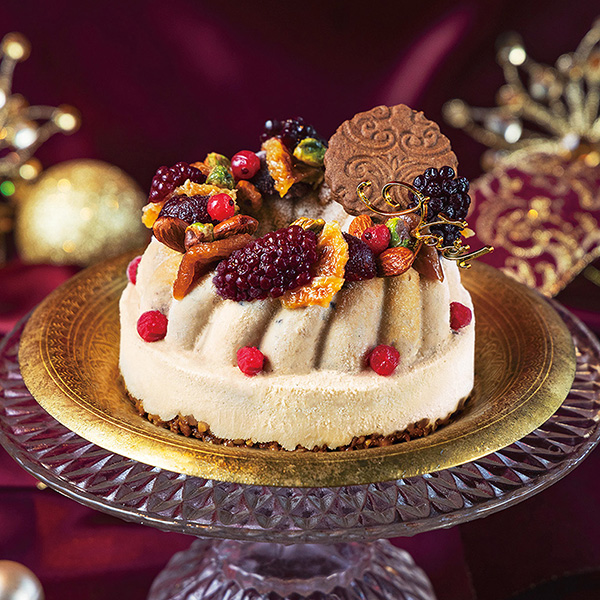 イギリスの伝統菓子クリスマスプディング。願い事をしながら家族皆で生地を混ぜて作るのがクリスマスの習わしです。葡萄にあんず、オレンジ、プルーン、デーツ、チェリーにベリー、そしてスパイスと黒ビールを入れた芳醇なジェラートと、上品な甘さのバニラジェラートを重ねて、土台のアーモンドとロータスシードのキャラメリゼの食感も楽しい。華やかにデコレーションしたクリスマスプディングのアイスケーキ。