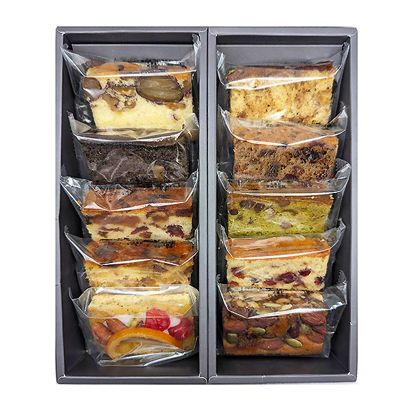 季節の〔渋皮栗〕を含んだ当店自慢の熟成ケーキ8種に、人気の見た目も華やかな紅茶とオレンジのケーキ〔みのり〕とオリジナルの焼き菓子〔ナッツモカ〕の入った全部違うお味が楽しい10個入りです。個包装でお日持ちも長い商品ですので、少しずつ楽しみながらも召し上がっていただけます。