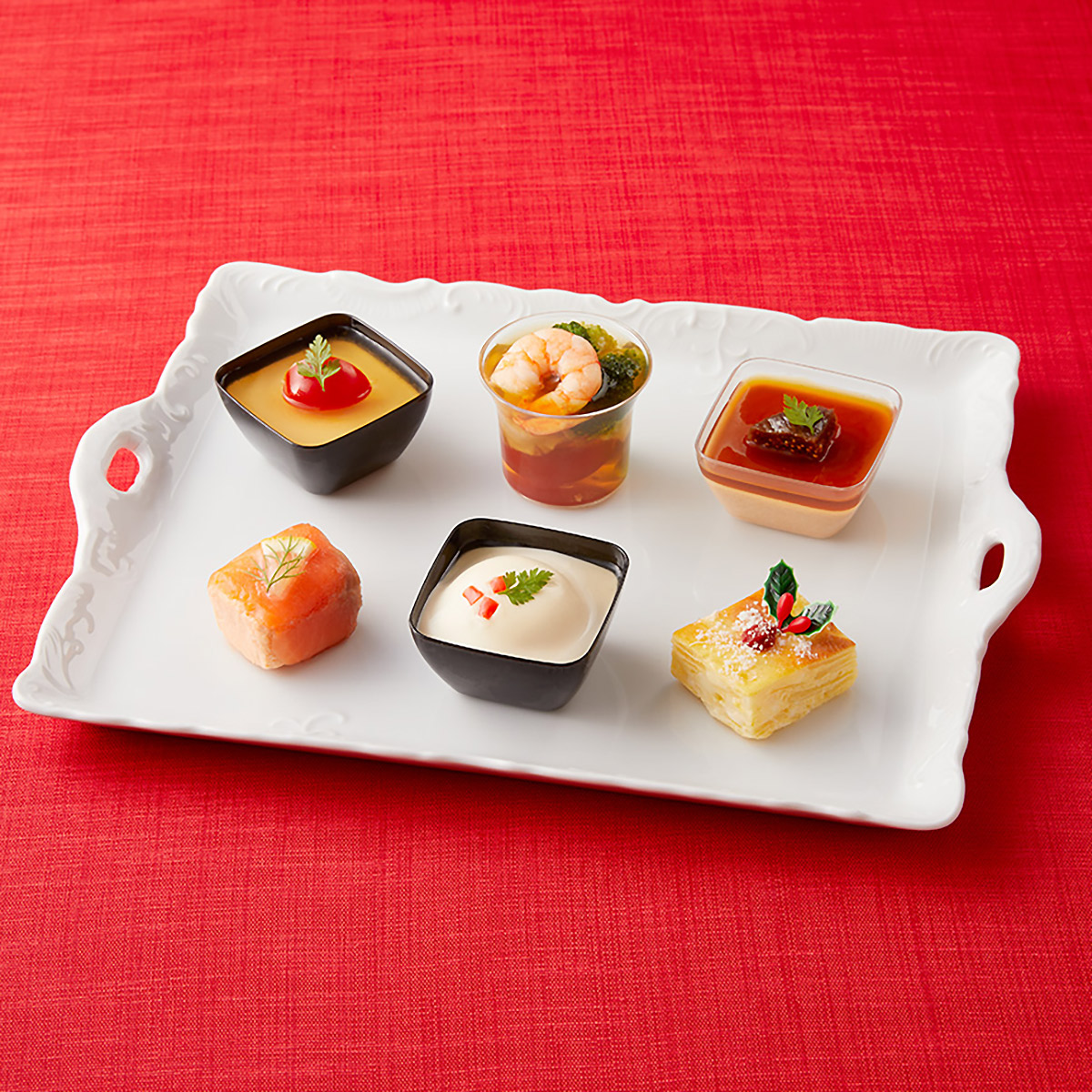 ●内容:ウニのフラン×1、フォアグラのフラン×1、白身魚の冷製×1、ポテトのミルフィーユオムレツ×1、サーモントラウトのテリーヌ風×1、エビ・帆立と野菜のコンソメジュレ×1