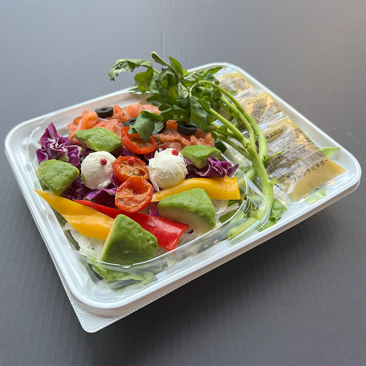 ●内容:ロメインレタス、スモークサーモン、アボカド、玉ねぎ、クリームチーズ、紫キャベツ、トマト、パプリカ、ひよこ豆、オリーブ、ピンクペッパー、ディル、レモン汁、オリーブ油、食塩、酸化防止剤(ビタミンC)