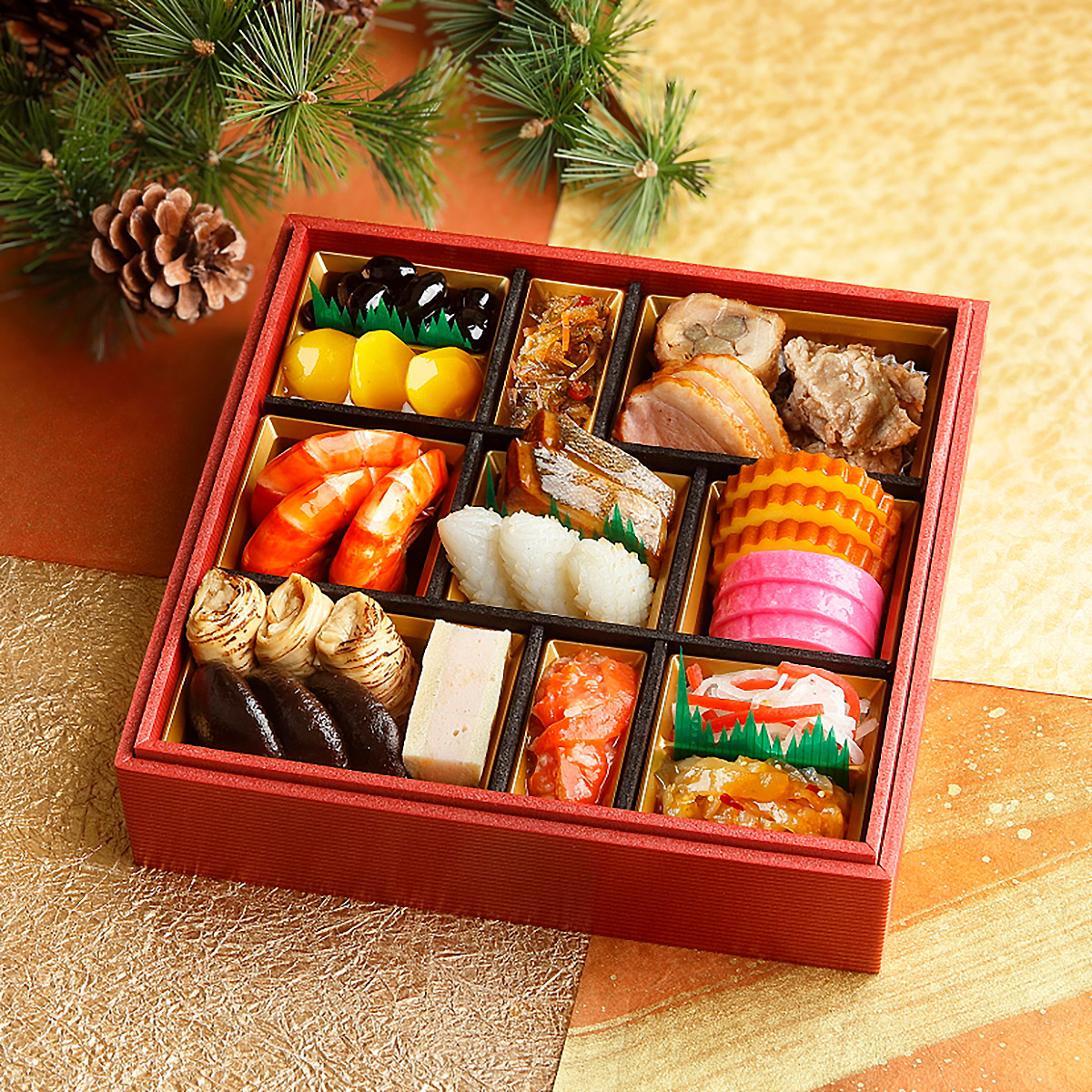 ●内容:黒豆、栗きんとん、松前漬、鶏八幡巻、牛肉香味焼、合鴨燻製、海老芝煮、鰤柚庵焼、松笠烏賊白焼、伊達巻、紅小袖蒲鉾、焼目湯葉含め煮、干椎茸甘露煮、海老高野豆腐煮、紅鮭糀漬、紅白なます、海月酢
