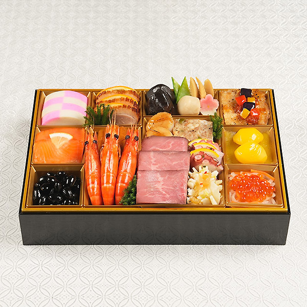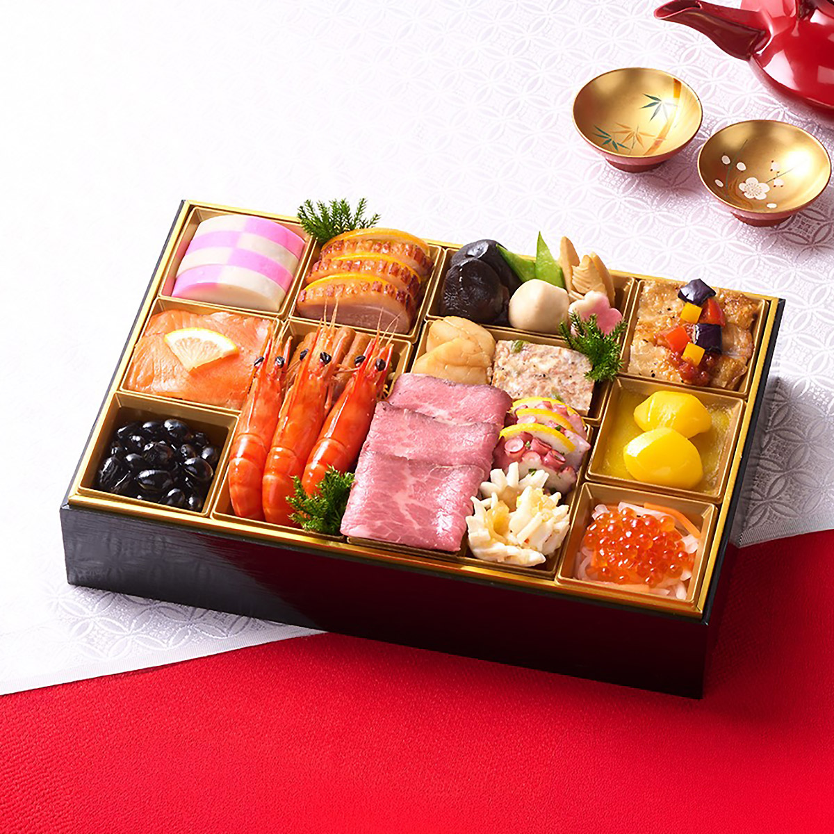 ●内容:市松蒲鉾、梅麩、サーモントラウト、帆立のバター醤油ソテー、春雨和え、ピスタチオ入りパテ、黒豆、ローストビーフ、合鴨スモーク、グリルオニオンと皮付きポテト、オレンジ、釜揚げたこのマリネ、伊達巻き、くらげとイカのねぎ生姜和え、有頭海老、グリルチキンのトマトソース、椎茸煮、栗きんとん、小芋旨煮、いくら、筍煮、紅白なます、絹さや