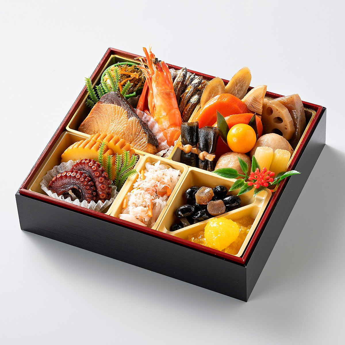 ●内容:ぶりの煮付け、里芋煮、なますかに添え{なます[大根、人参、穀物酢、砂糖、昆布(乾燥)]、紅ずわいがに酢漬け}、伊達巻、人参煮、栗きんとん、有頭海老のうま煮、蒟蒻煮、黒豆煮、筍煮、たこのうま煮、ごぼう煮、田作り(カタクチイワシ、砂糖、みりん、醤油、その他)、するめ寒干松前漬(割干大根、発酵調味料、醤油、みりん、砂糖、醸造酢、人参、するめ、その他)、ふき煮、蓮根煮、昆布巻、金柑煮