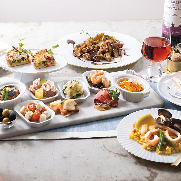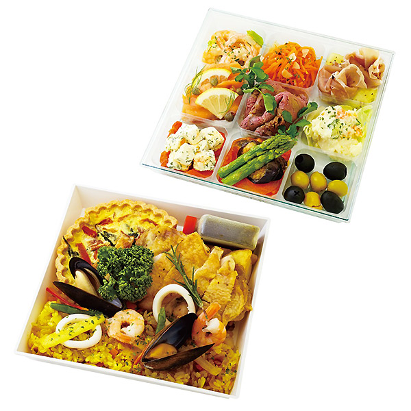 ●内容:上段:カクテルシュリンプ、キャロットラペ、生ハムメロン添え、スモークサーモン、ローストビーフ、ポテトサラダ、フェタチーズマリネ、彩り野菜のアラビアータ、オリーブ