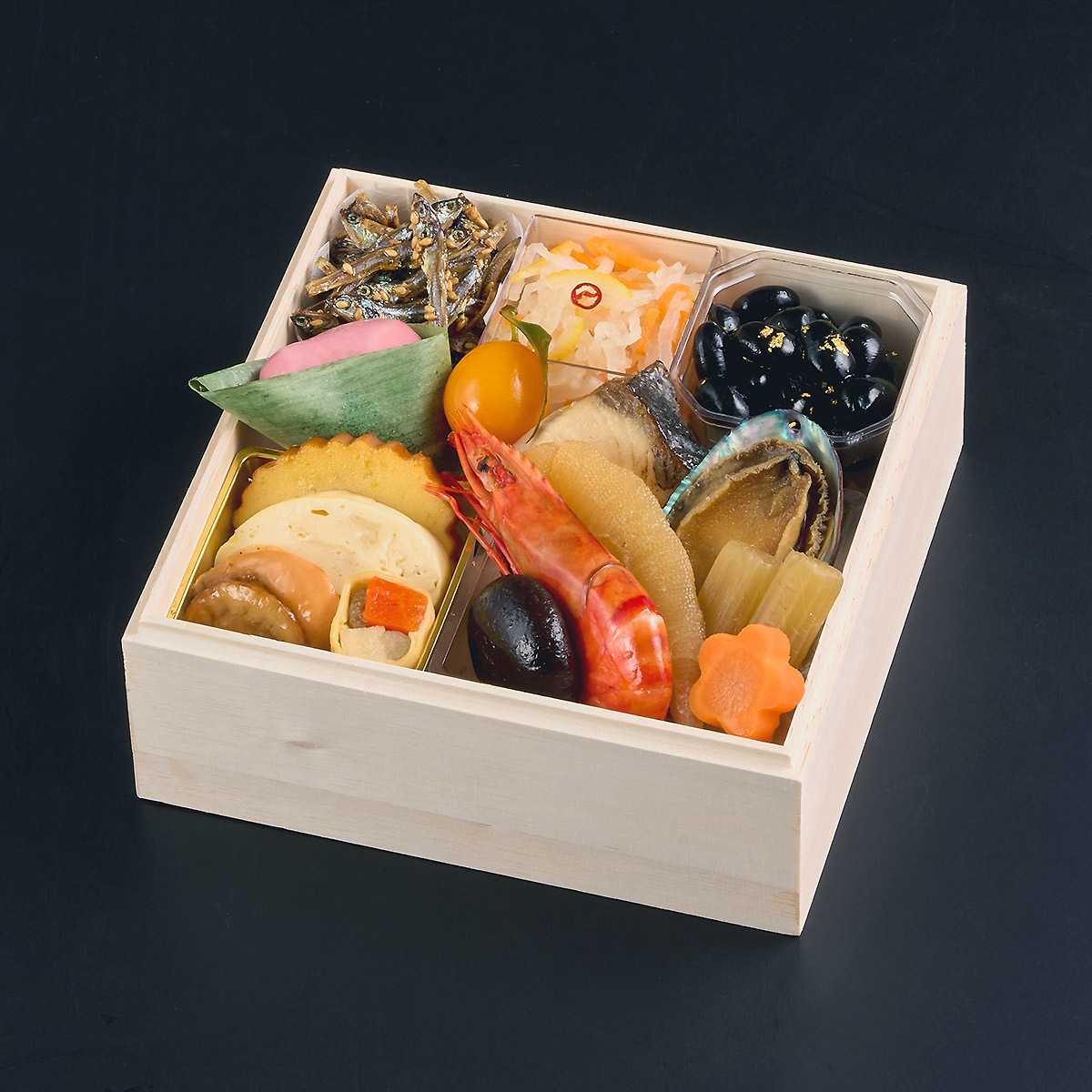 ●内容:田作り、紅白なます、黒豆、笹麩まんじゅう(紅)、葉付き金柑、柚子入り伊達巻き、湯葉入りかまぼこ、帆立山椒焼き、高野豆腐と野菜の湯葉巻き、鰤柚庵焼き、煮あわび、煮海老、数の子、蕗、椎茸、梅人参