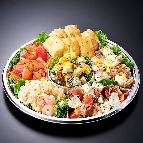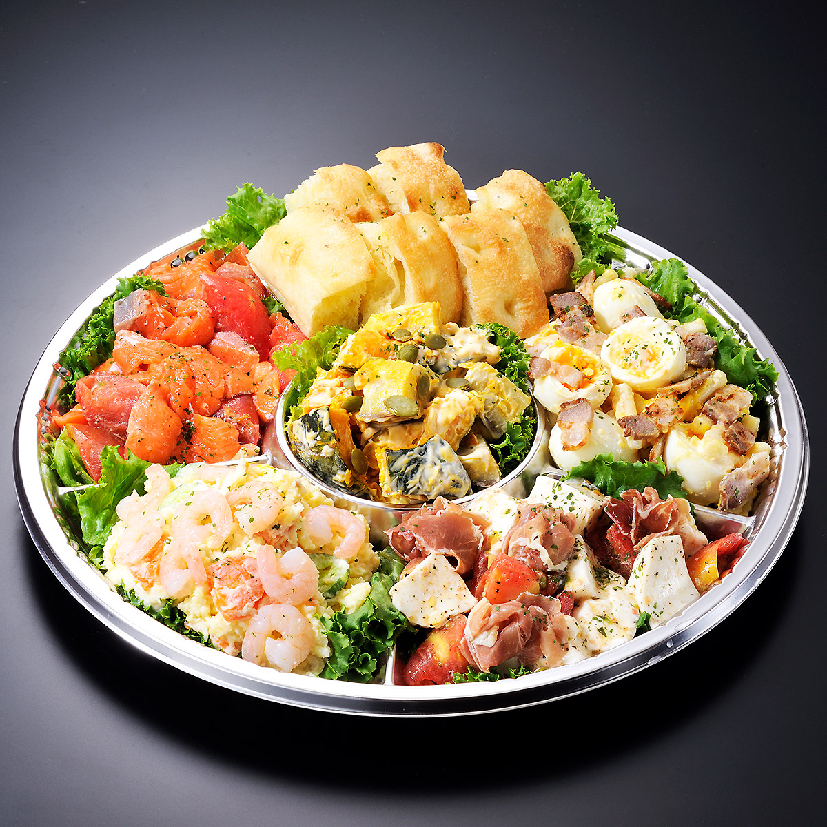 ●内容:4~5人前、サーモンとトマトのカルパッチョ、イタリア産モッツアレラハモンセラーノのカプレーゼ、小海老入りポテトサラダ、自家製ベーコンと半熟卵のマカロニサラダ、かぼちゃとサツマイモのサラダ、自家製フォカッチャ●商品に含まれるアレルギー特定原材料8品目:えび、小麦、卵、乳成分●消費期限:翌日中(要冷蔵)※お受取の際はご注文確定メールを当日プリントしてお持ちいただくか、メールの受信画面をご提示ください。※お申し込み後のキャンセルやお渡し日の変更はできません。>>さっぽろ店美味満載市 商品一覧
