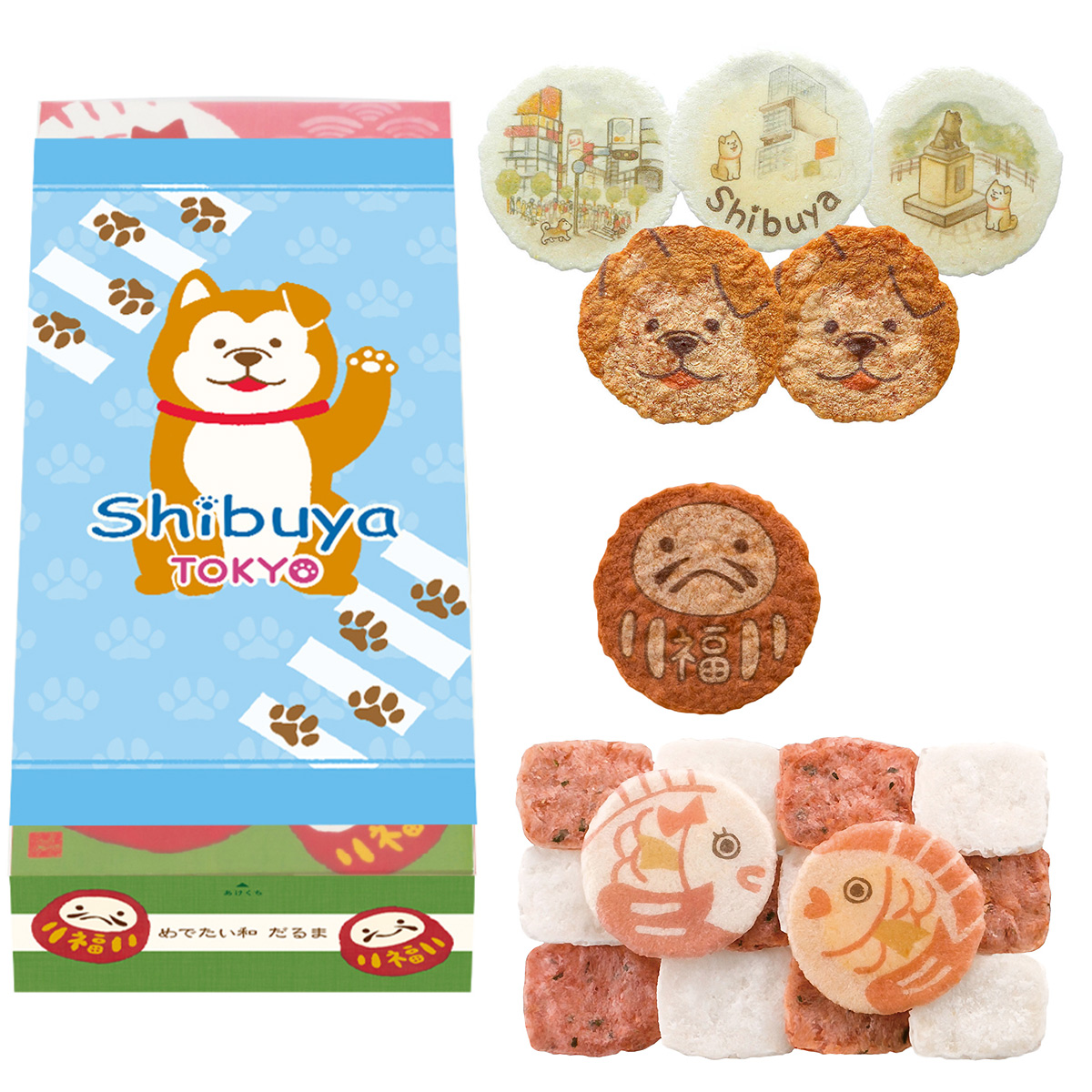 ◎渋谷ヒカリエ ShinQs(シンクス)取扱商品東横のれん街限定の「渋谷えびせんべい」とめでたい和の「紅白鯛」、「だるま」を詰合せました。可愛らしいわんこや紅白の鯛、だるまが描かれたえびせんべいです。ハチ公の掛紙もついており、今だけの限定商品です。