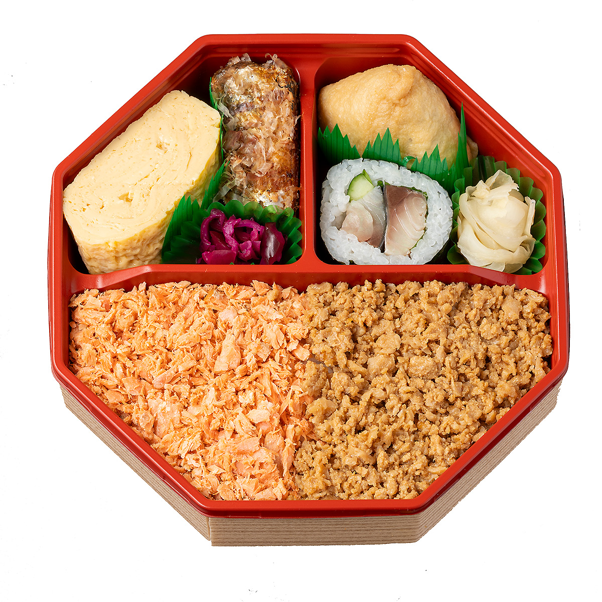 ●内容:だし巻、いわし花まぶし、いなり寿司、さば巻寿司、鮭ほぐし、鶏そぼろ