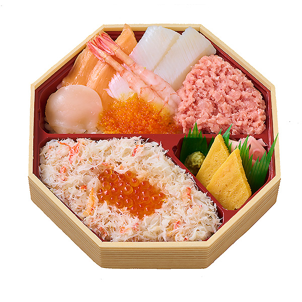 ●内容:酢飯、いくら、カニフレーク、まぐろたたき、甘えび、サーモン、イカ、ホタテ貝柱、イカ黄金、とびっこ、厚焼玉子、粉わさび、ガリ、別添えで醤油