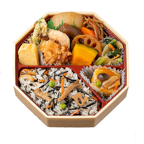 ●内容:ひじきご飯、煮物(大根うま煮、生芋こんにゃく、蓮根煮、人参煮、かぼちゃのうま煮)、鶏の唐揚げ、名古屋えび天、ちくわの磯辺揚げ、揚げ豆腐のあんかけ、厚焼玉子、金平ごぼう、小松菜と大根の甘酢生姜のおひたし