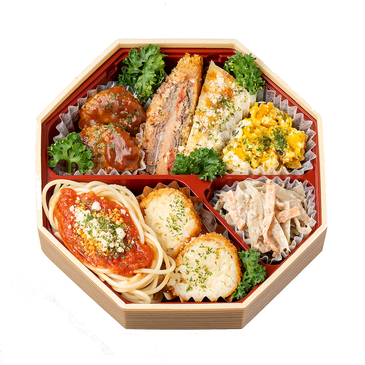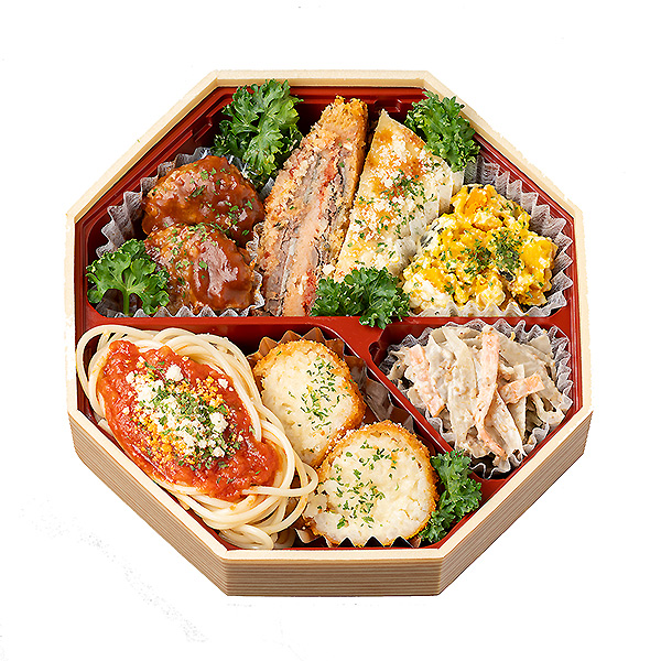 ●内容:デミグラスハンバーグ、いわしの重ね焼き、ポテトグラタン、パンプキンサラダ、金ごまごぼう、リゾットコロッケ、トマトソースパスタ