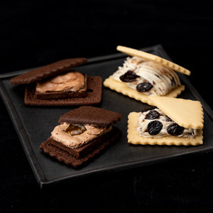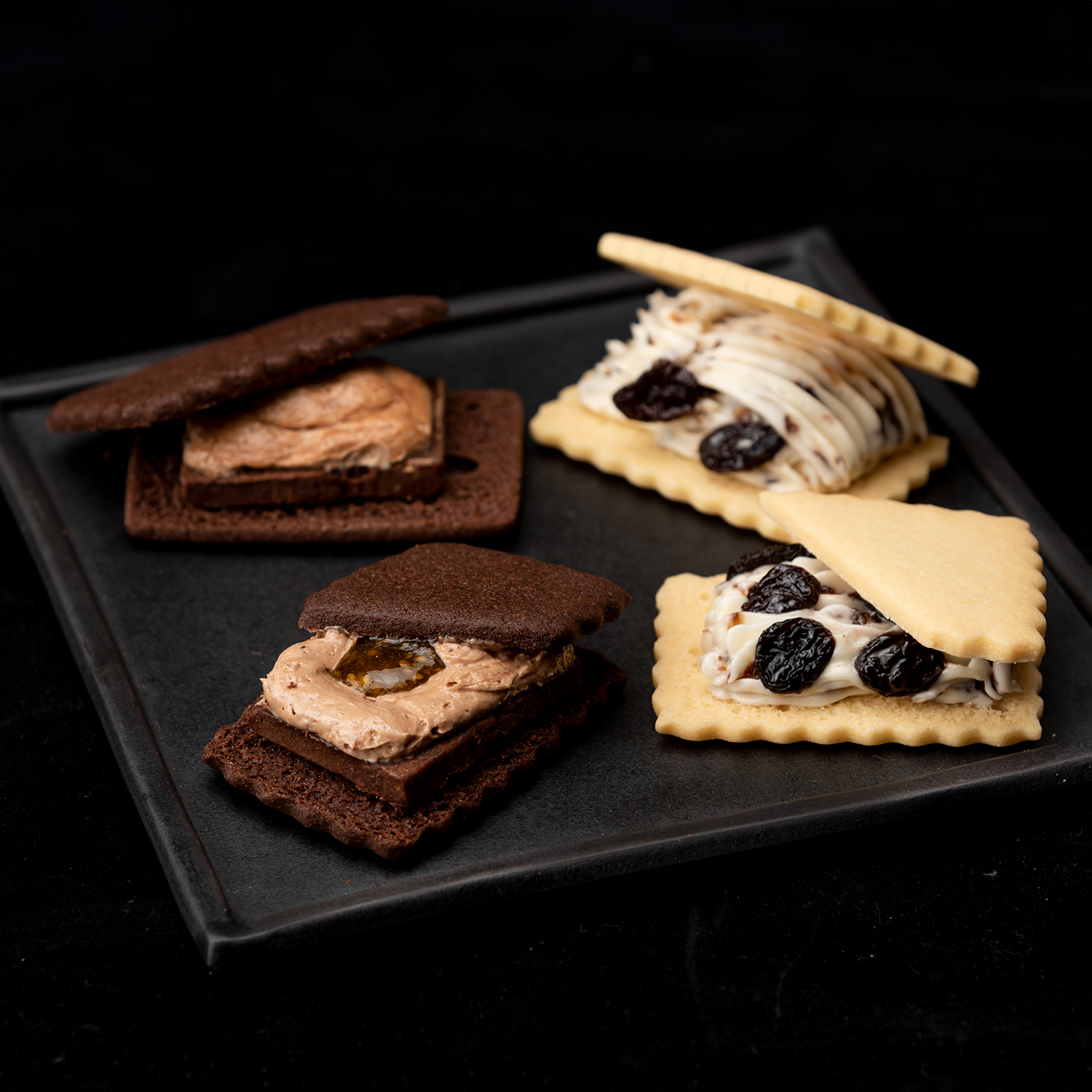 発酵バターを使用したタルト生地にホワイトチョコレートクリームとレーズンをサンドしたプレミアムショコラウィッチ(レーズン)とガナッシュ・チョコレートバタークリーム・ほおずきコンフィチュールをサンドしたプレミアムショコラウィッチ(ほおずきショコラ)のアソート。