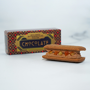 カカオバターをたっぷり含んだ「クーベルチュールチョコ」をベースに、ブランデーオレンジを加えた贅沢なフィリングが特徴です。ココアパウダー入りクッキーが、味にさらなる深みを与えます。