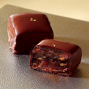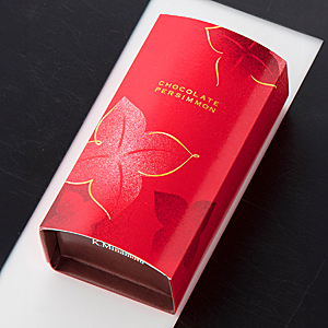 くるみ入りのショコラあんと国産干柿を重ね、ダークチョコレートで包みました。