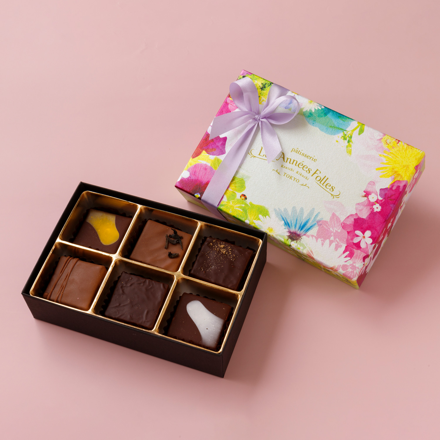 東京・恵比寿のパティスリーレザネフォールから、一粒一粒丁寧に作られたボンボンショコラです。濃厚なショコラに、味わい豊かなガナッシュを楽しめる一箱です。6粒すべて味わいが異なり、色々な種類が楽しめます。贈り物にも、ご自分へのご褒美にもオススメです。