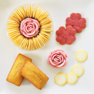 ●詰合せ内容:リングバニラローズチョコ1個(ラングドシャバニラ30g、ローズチョコ1個、フレーズサブレ2枚)、フィナンシェ3個