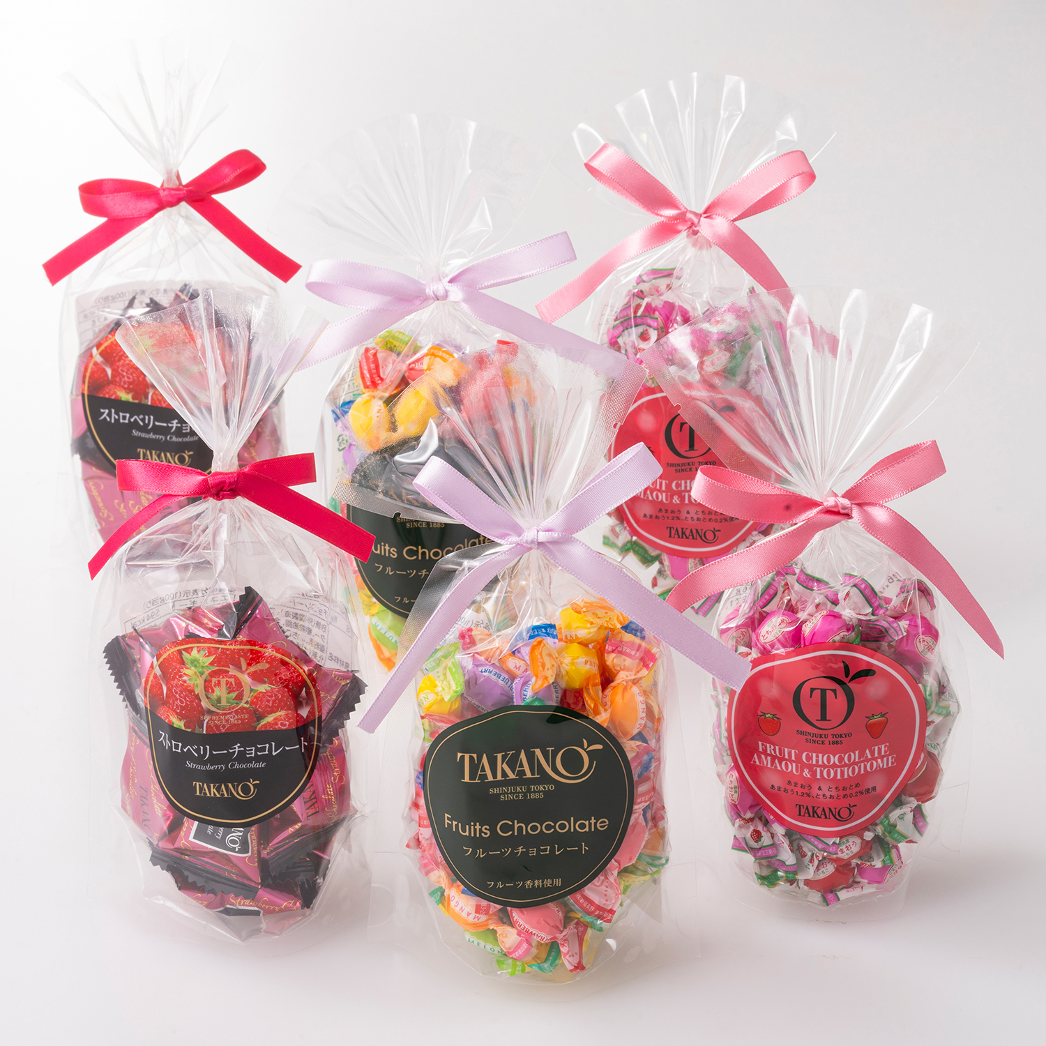 ●詰合せ内容:フルーツチョコレートSPリボン80g(個包装紙込み)、ストロベリーチョコレートSPリボン55g(個包装紙込み)、あまおう&とちおとめチョコレートSPリボン65g(個包装紙込み)×各2、ピーチ角底紙袋6枚付