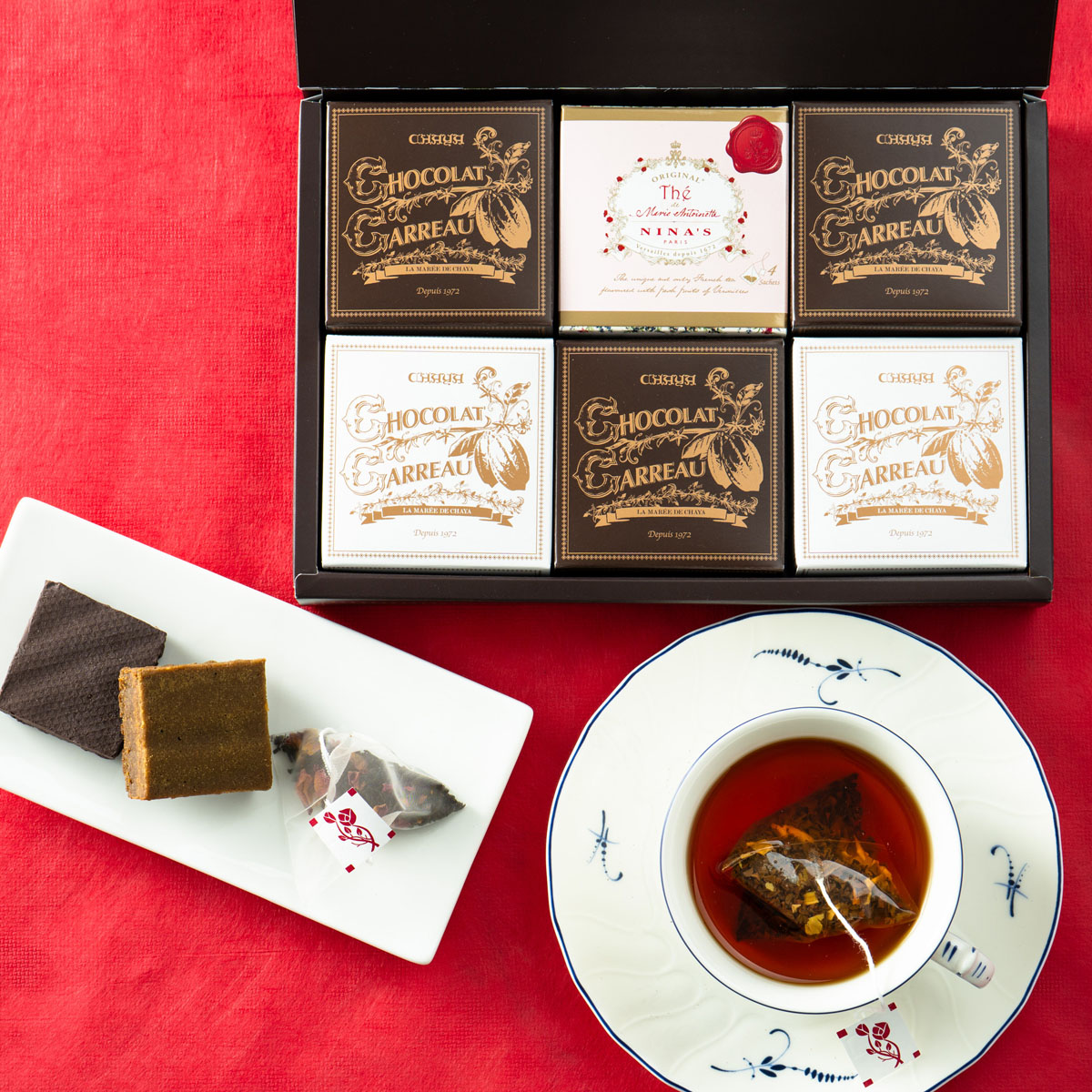 ●内容:葉山のショコラ・カロ3個、葉山のショコラ・カロ ミルクティー2個、ニナス オリジナル マリー・アントワネットティー1個
