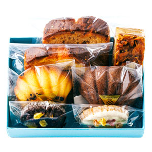 ●内容:マドレーヌ(カレンツ・ショコラ)、パウンド(苺・マンゴー)、フロランタン、フルーツクッキー(スイートチョコ・ホワイトチョコ)各1個