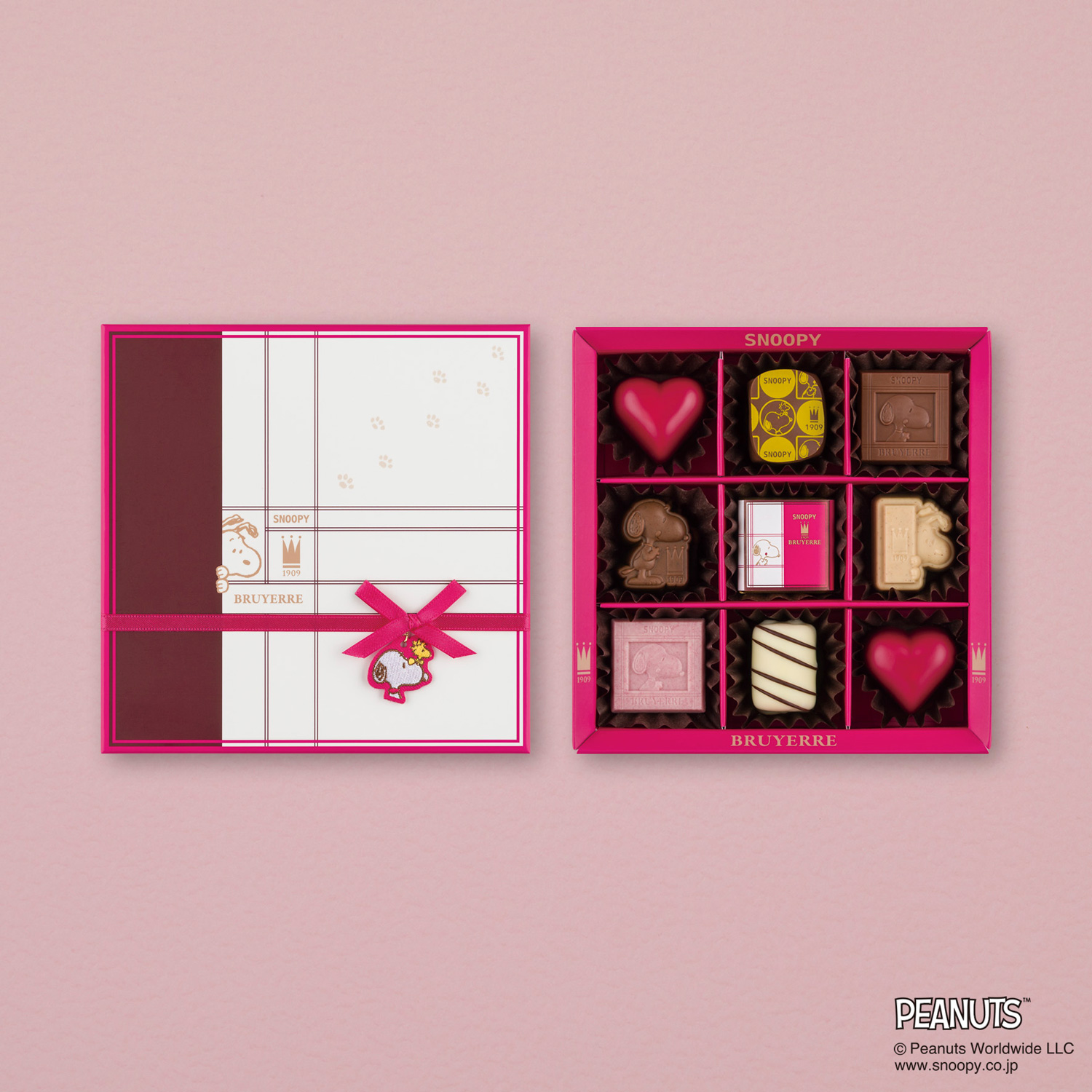 ブリュイエール自慢のヘーゼルナッツプラリネをミルクチョコレートで包み、スヌーピーデザインをプリントした「スヌーピー・ヘーゼルナッツプラリネ」。ほんのり酸味のあるラズベリーが練りこまれた赤いハートの「フランボワーズ・プラリネ・ハート」。ミルクチョコレートにヘーゼルナッツプラリネを練りこみ、カラメルフレークの粒感をアクセントにした、スヌーピーシェイプの「スヌーピー・ノアゼット・ミルク」など、スヌーピー meets ブリュイエールのチョコレートをすべて味わえるセレクション。