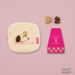もこもこ生地に、立体的な耳のスヌーピーと、ウッドストックの刺繍がすてきなスクエア型ポーチ。落ち着いたベージュカラーで新登場。中の小箱には、2種類のスヌーピーシェイプチョコレート(各1粒)が入っています。