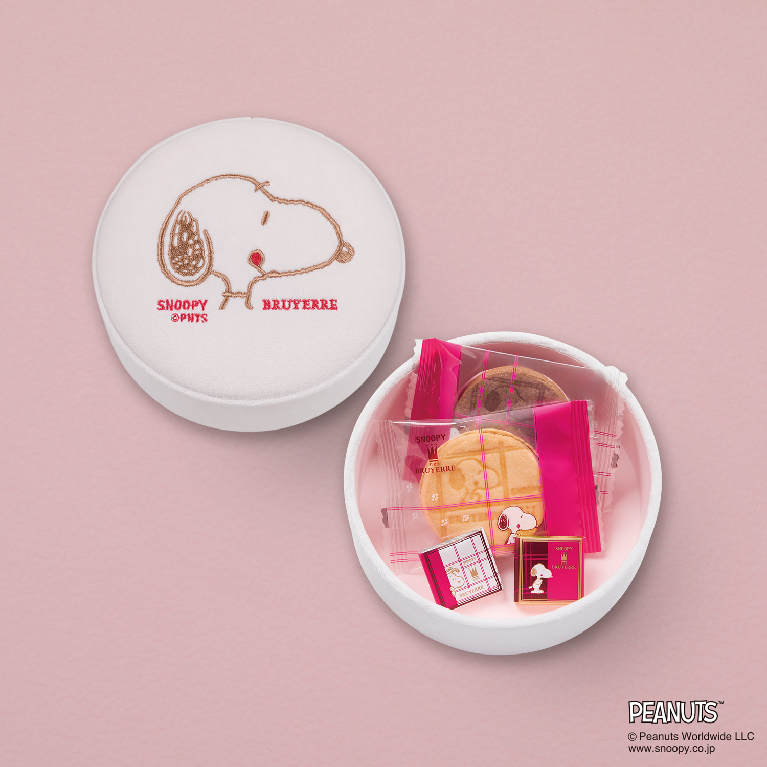 プレーン生地の焼菓子に、ミルクキャラメルフィリング入りのチョコレートをサンドした「ビスキュイサンド・ミルクキャラメル」、ココア生地の焼菓子に、キャラメルフィリング入りのストロベリーチョコレートをサンドした「ビスキュイサンド・ストロベリーキャラメル」(各1枚)。スヌーピーのポートレートデザインが素敵な個包装チョコレート(ミルクチョコレート1個、カシスチョコレート1個)。